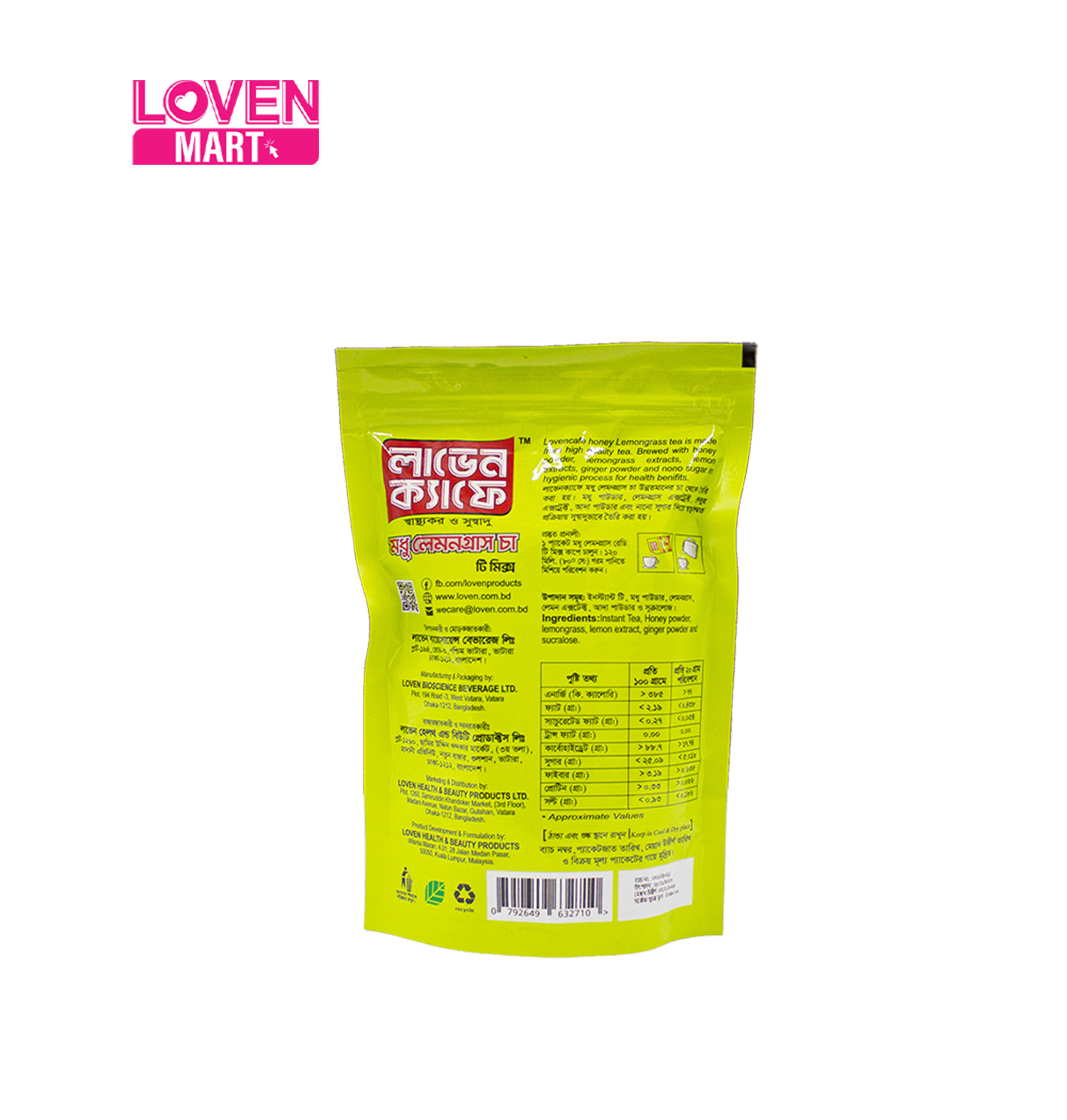 Loven Café-এর মধু লেমনগ্রাস টি প্রিমিক্স হলো একটি স্বাস্থ্যকর ও সুস্বাদু ইনস্ট্যান্ট পানীয়। উচ্চ গুণমানের চা, লেমনগ্রাস, আদা এবং মধুর প্রাকৃতিক সুগন্ধের সাথে সামান্য সুক্রালোজ (low-calorie sweetener) ব্যবহার করে এটি মালয়েশিয়ান ফর্মুলেশনে তৈরি করা হয়েছে।